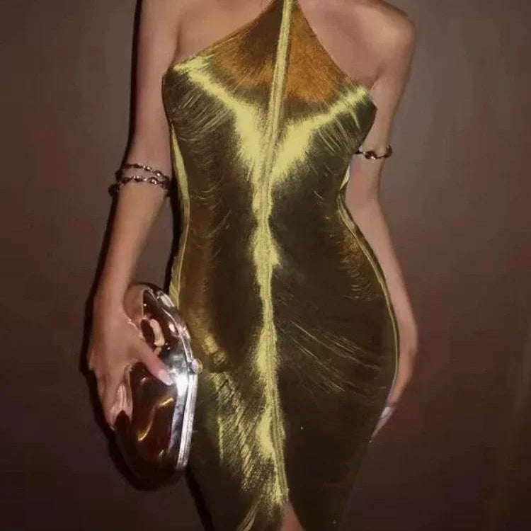 Crafted from smooth polyester with a slight stretch, it hugs your figure while the empire waistline flatters your shape. The bold V-neck front draws attention, while the overall mini length keeps the look playful, confident, and unforgettable.