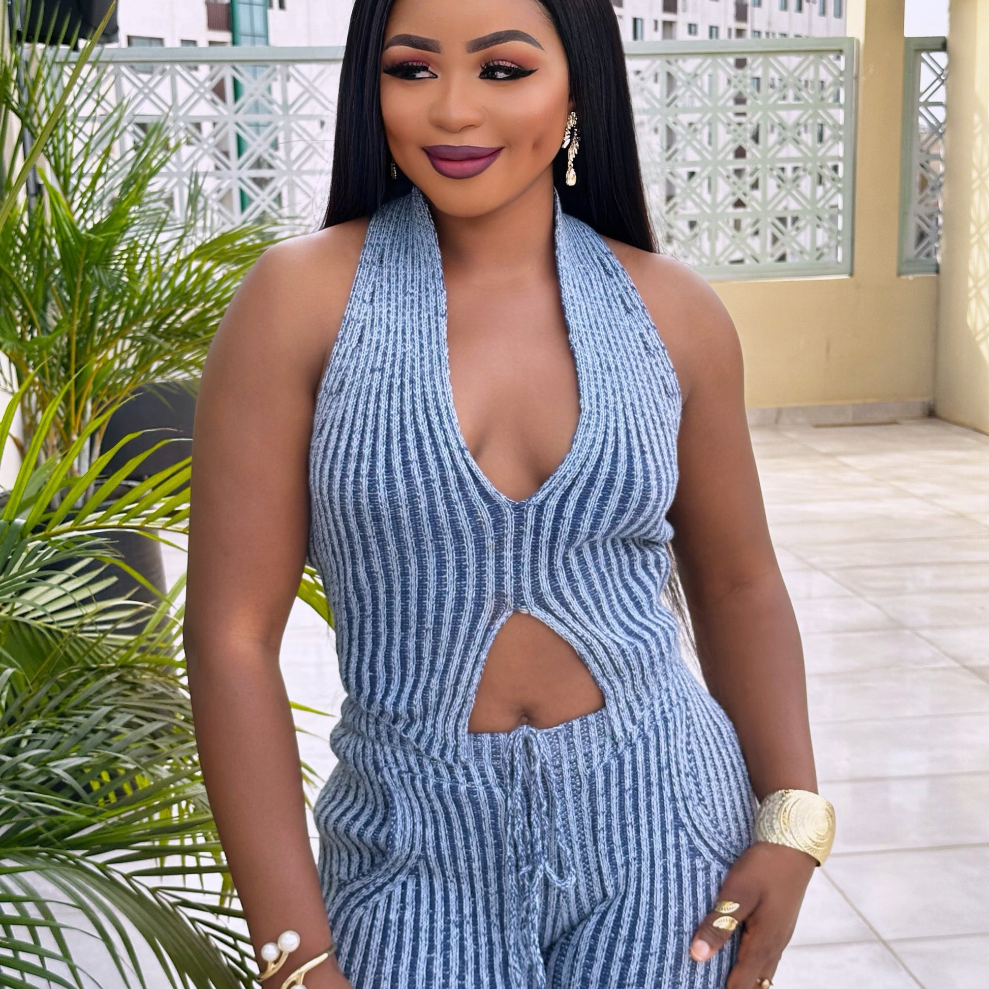 This Striped Crochet Halter V-Neck Vest & Pant Set is versatile and can be accessorized to suit any occasion, whether it's a casual day out, a brunch with friends, or a special evening event. Pair it with your favourite heels or sandals, and you’re ready to turn heads wherever you go!